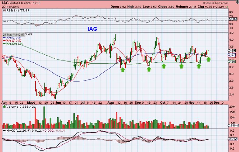 IAG is a long consolidation that is riding along the 200sma and also moved above the 50 sma recently. AUY looks the same as IAG.