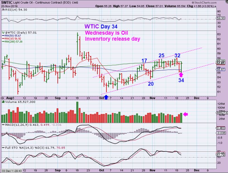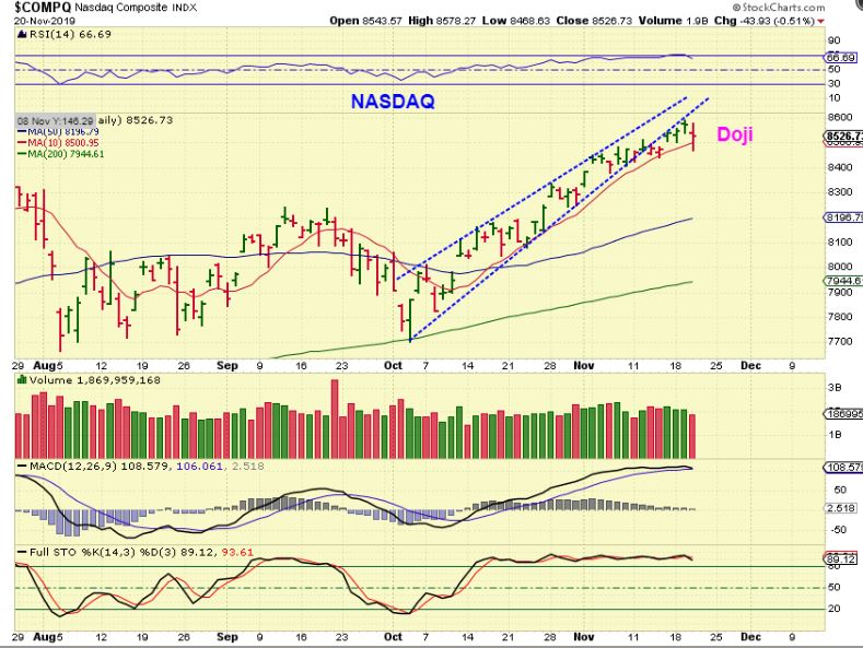 NASDAQ  – The NASDAQ looks like a Doji, could be a reversal, and also broke that 10 sma & recovered. It is Day 32 and that is why this could begin to drop down.