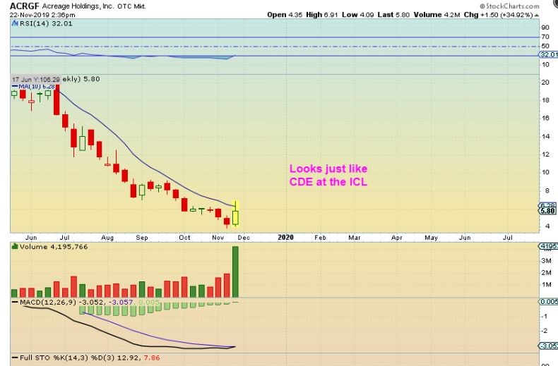 ACRGF – TWINS? Yes, I am seeing this blast out of the MJ Sell off as being quite similar to the blast out of the Gold ICL. Scroll up & down and compare the 2 charts again.