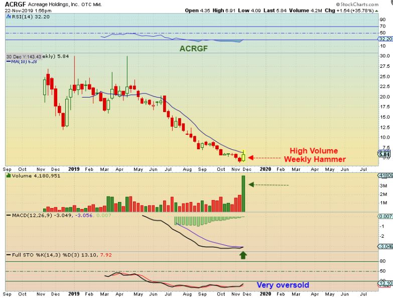 ACRGF – I’m back at ACRGF to show that it has been deeply oversold for many weeks. What if it runs until it is overbought? Seems like gains will be big.