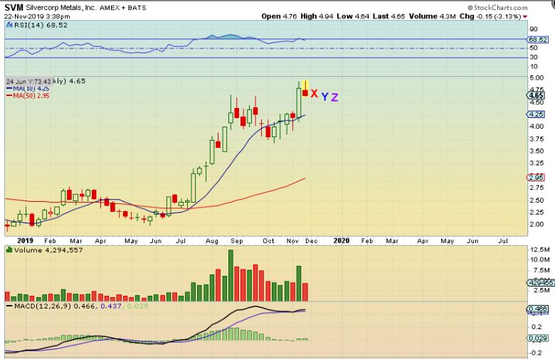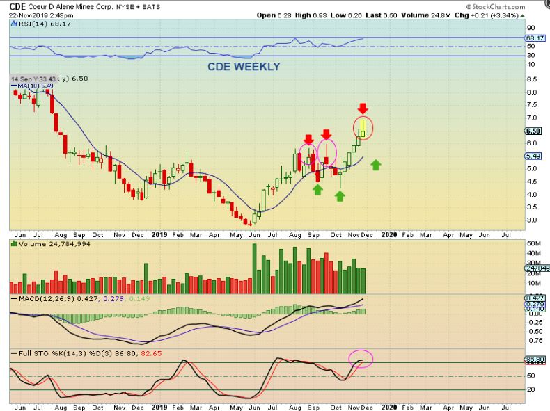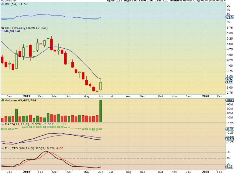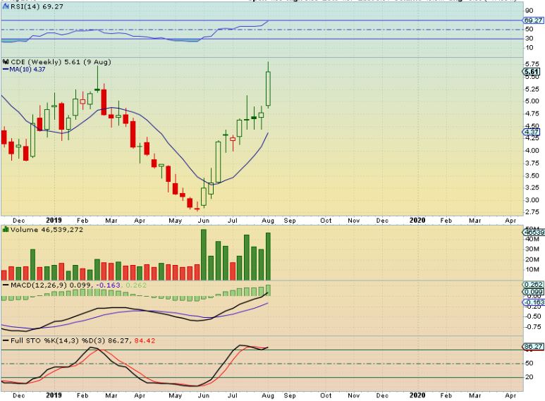 CDE – CDE has had a nice run, but couldn’t hold those highs last week. This is a shooting star on a weekly candle and could pull back a bit as the USD moves higher.