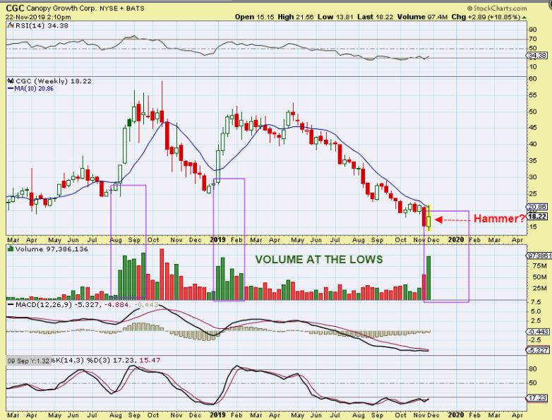 CGC WEEKLY – CGC ran from $13.80 to $21.56 last week alone, and tagged that 10 week ma and then sold off. Volume ramped up immensely. Look at the last 2 rallies when Sell offs turned into high volume reversals. I basically see $25 to $50+ each time.