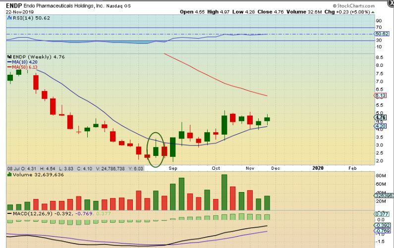 You may recall that I was pointing out the bull run in ENDP as similar to MJ Stocks in Fridays report. This one Popped but then went sideways, then higher, then sideways, then higher. Did the Weekly chart also have that reversal candle at the lows? Yes…