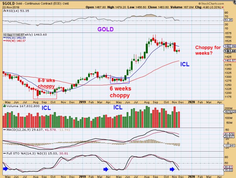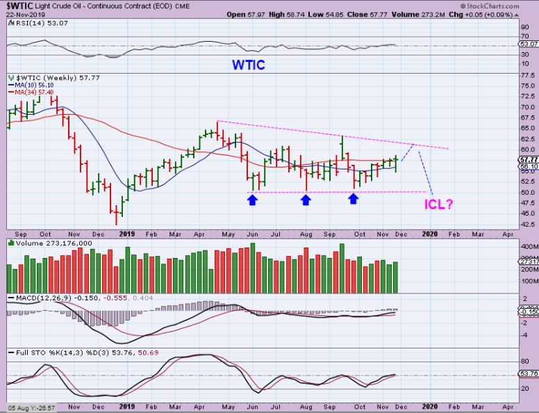 WTIC – Oil has been choppy and sideways, but it did close at the top of the weekly trading. Constant choppy sideways action is unpredictable, so this chart does NOT have to top where I drew a possible turn, this is just an idea that keeps in mind that an ICL will come due at any time.