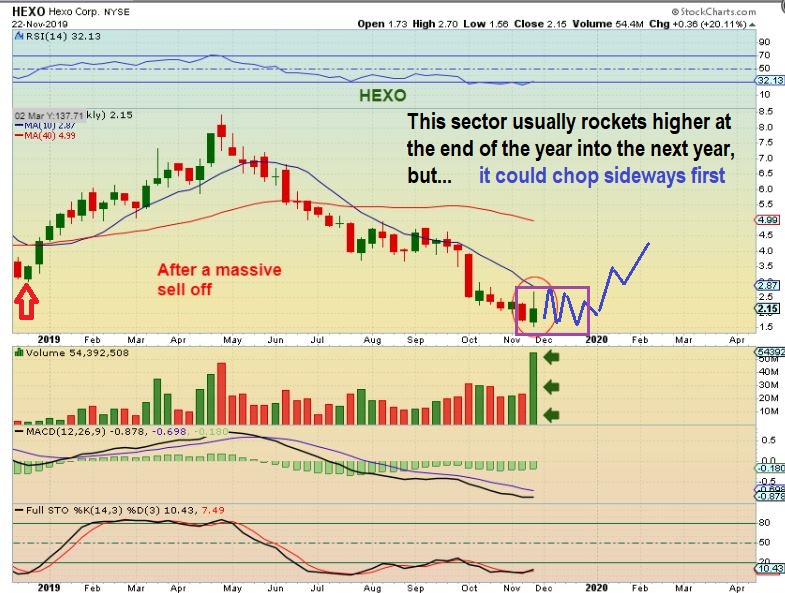 HEXO WEEKLY – Often these rocket higher, but I also want to mention the possibility of a small base building into December that can be choppy & frustrating . That just means that some traders might just want to wait until the weekly price gets over that 10 week ma ( 50 sma daily chart). See the chart. I will now show you why we could see this too…