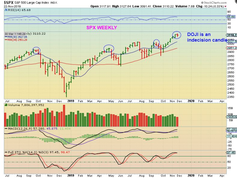 SPX WEEKLY – We are expecting a dip into a dcl, and we have a Doji, which is a possible topping candle of indecision.