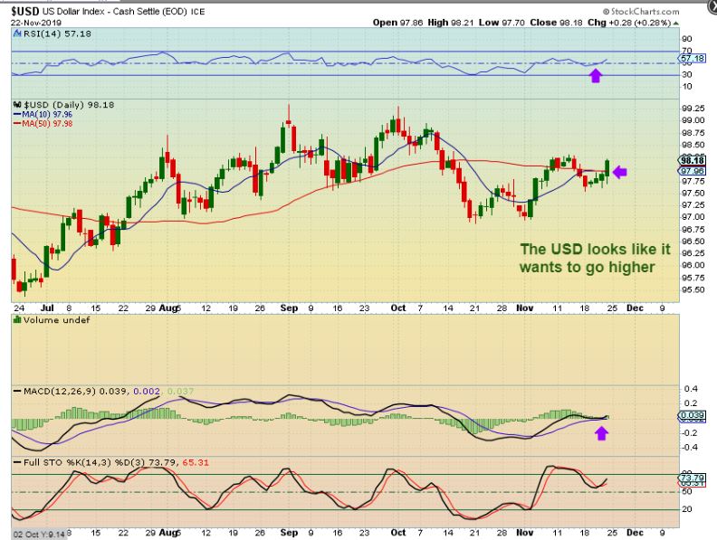 USD WEEKLY– The USD has moved sideways for 3 weeks. A run higher in this channel MIGHT push Gold lower, and the daily chart does look like it wants to go higher. Let’s look at the daily chart.