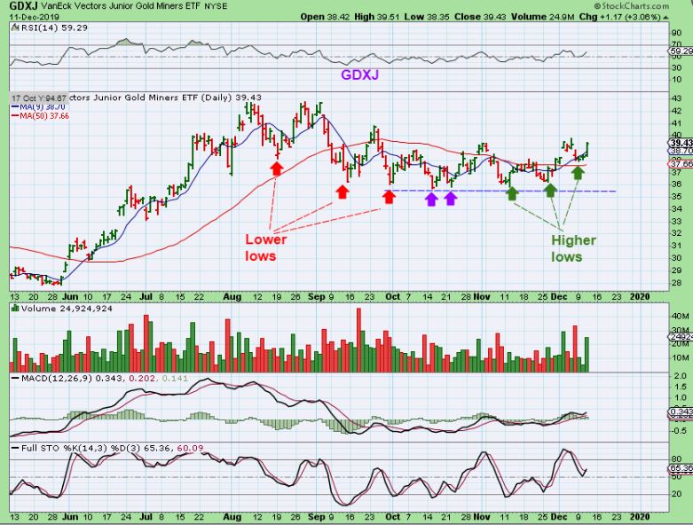 GDXJ – So we are seeing higher lows and attempting higher highs. THAT is what starts an uptrend out of a base. This has been very choppy and difficult, but it is starting to look more like it will run higher. What about that part where they often form cups?…