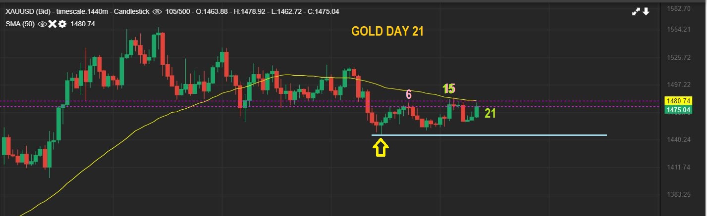 GOLD – This is day 21 and since the 50 sma rejected price, we could still chop around for a while.