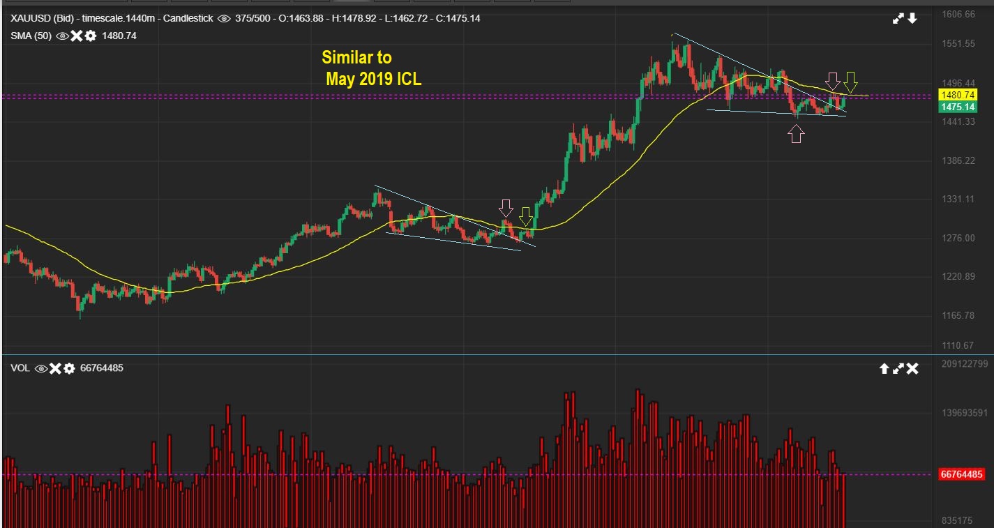 GOLD – Gold turned higher at that trend line back test, but it did not get above the 50sma yet. This looks a LOT like the choppy ICL (lows) that we got in May 2019. Notice the comparison & look at the run that followed.