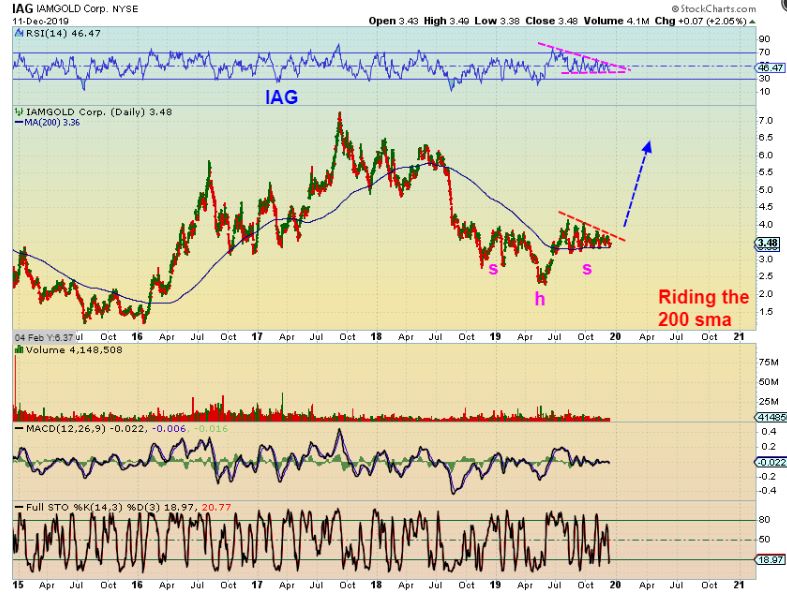 IAG – I have shown this before, but I wanted to step back and show this view of IAG. This is a tightening wedge bouncing right along that 200sma. It is a low risk buy too.