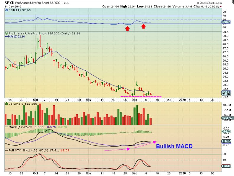 IS THAT BULLISH? – This looks like a bullish set up, with a double bottom and a rising MACD & RSI, right? This looks like it wants to go higher soon. This is the inverse SPX etf ( Short SPX), so just Stay frosty if you are long the General Markets.
