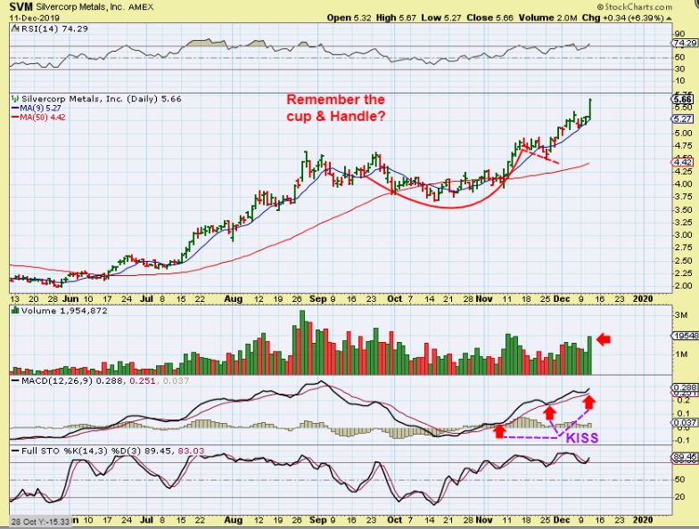 SVM #2 – A cup can form a small choppy handle and then take off again. If GDX / GDXJ or another Miner does this, you want to Buy while it is still near the base. You can also buy the handle later. We are in the base right now.