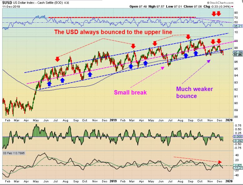 USD – Look at the final bounce in the USD on this chart. For the first time in over 1 & a 1/2 years, it could not reach the upper blue line. It broke down Thursday after the Fed Meeting below the lows too. Now look at the RSI on the final 2 months of this chart. It was unable to reach that 70% line. The USD looks to be weakening.