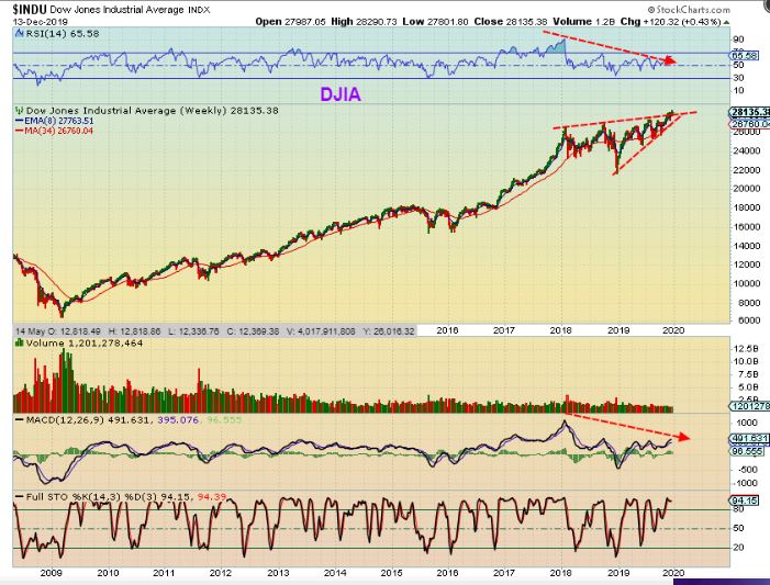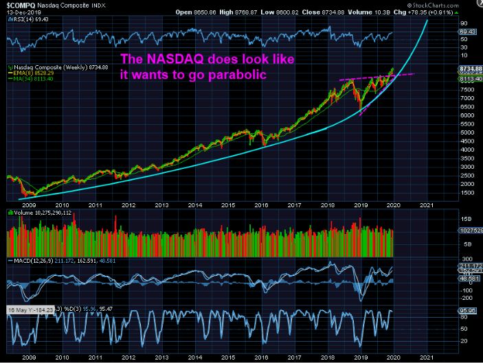 NASDAQ – We see that the NASDAQ also looked like a wedge, but it broke out higher & has held above the break out. Wht if that continues?   THAT COULD SIGNAL a steeper climb is coming- one that could conclude as a parabolic blow off top. Also …