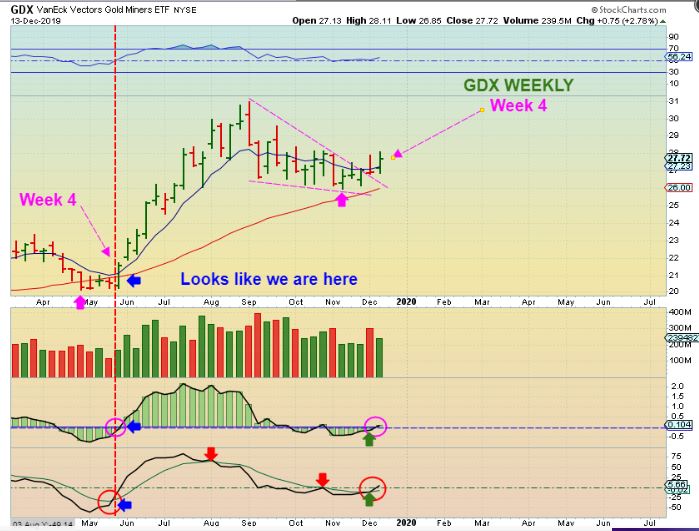 GDX WEEKLY BREAK OUT  – Look at MAY 2019.  After a sideways chop, on week 4 it pushed higher above the 10 sma & my indicators below triggered .  The exact same thing has happened now. Now look at how big of a run followed from May to September.  A duplicate would run from now to March or April.  This chart is calling the Bulls.