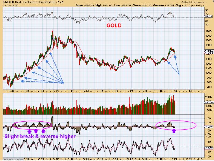 GOLD BIG PICTURE  – This is Very Bullish as a Big Picture. An ICL was due at the latter part of 2019, and it looked like Gold should back test that base break out of the base, but this might be all we get for a pull back. I got a STRONG BUY in GDX in November and this current reversal is similar to where the 2008-2011 Bull Run would have reversed.  See the chart.