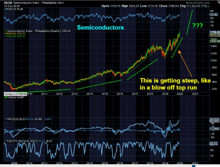 SOX / Semiconductors – The current choppiness in the SOX is actually turning into a steep climb too. This looks a bit more advanced than all the others, so with the SOX chart and the above 3 charts, I think that we can conclude that a parabolic blow off top is very possible.  The SOX may be leading the way.