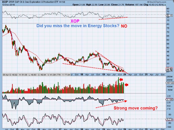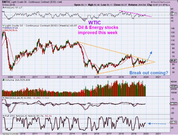 WTIC  – Oil has been choppy and sideways all year, but now as 2019 is ending, so might this chop. We are in the APEX of a triangle, and a break out can start a trend. Many Oil / Energy stocks also began running out of the lows – we discussed OAS, DNR, LPI, WLL, XOP, etc etc , even in my last report Friday.  They popped 10-20% for the week, but have we ‘missed the moves’ if you weren’t in yet??…