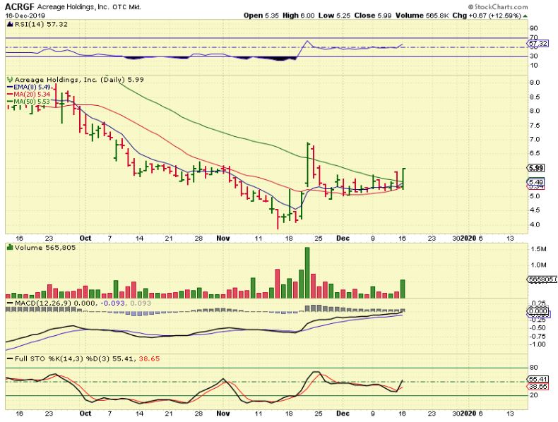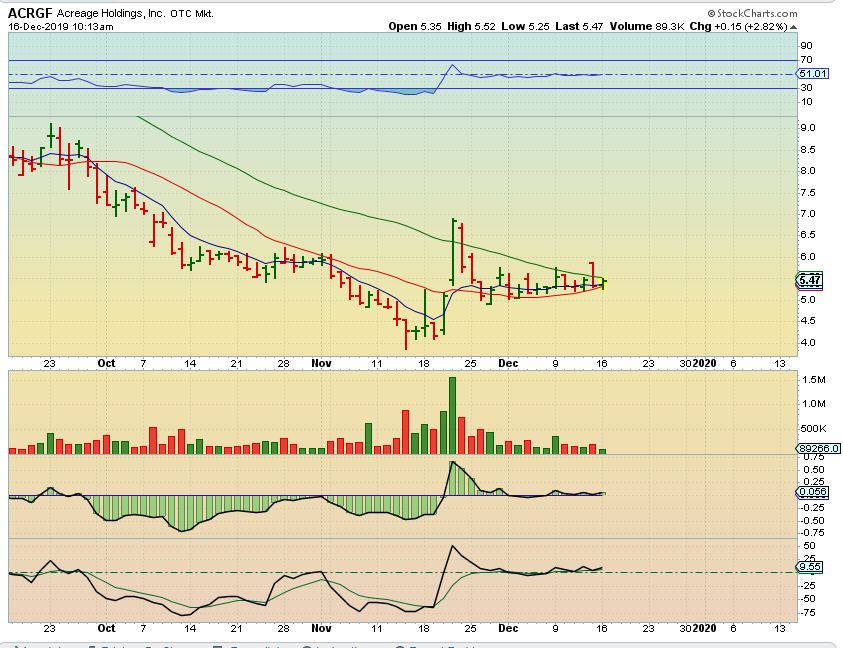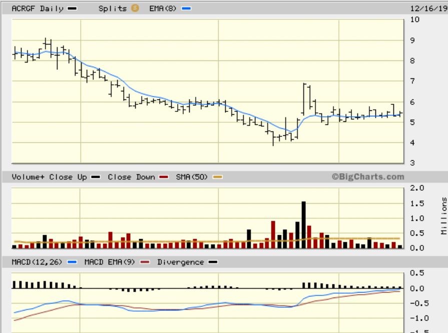 ACRGF AT THE CLOSE  –  ACRGF closed up about 12.6% at $6! It is above that 50 sma and this looks very promising.