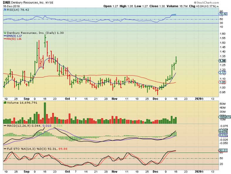 DNR – So several of the Oil / Energy stocks mentioned in prior reports are just running higher. They bounce off of the 8 ema or 10sma and keep running, so what to do next?  Wait for a pull back, eventually we will see one,  OR I mentioned that you could buy Laggers or ones that are not as extended.  I even said that AXAS was one that looked good as a tight base…