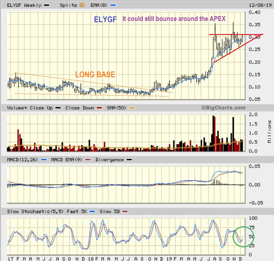 ELYGF WEEKLY  –  BY REQUEST:  I own this and have mentioned that in the Live area, but I never really mentioned it as a ‘buy’ before because it had low volume  on the daily charts  when I entered it.  For me it is a BUY & HOLD through the bull market run, but I was asked why I never mention it in the reports if I own it.