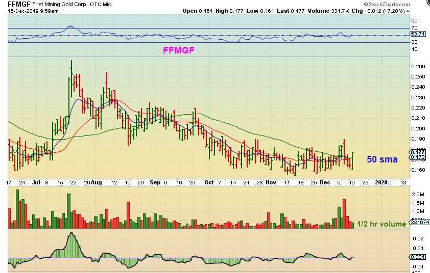 FFMGF  – First Mining Popped above the 50 sma yesterday, so I posted this after the first 1/2 hr of trading.  It closed here with almost 1 million in volume, so this may be ready to run.  You can buy it in this base or put it on a watch list.