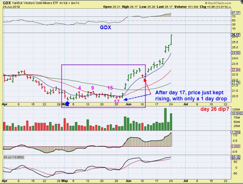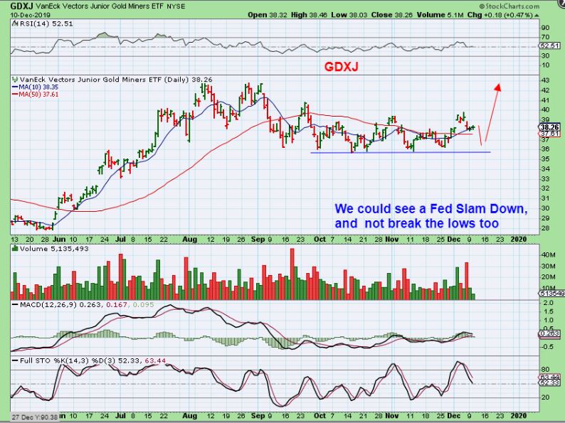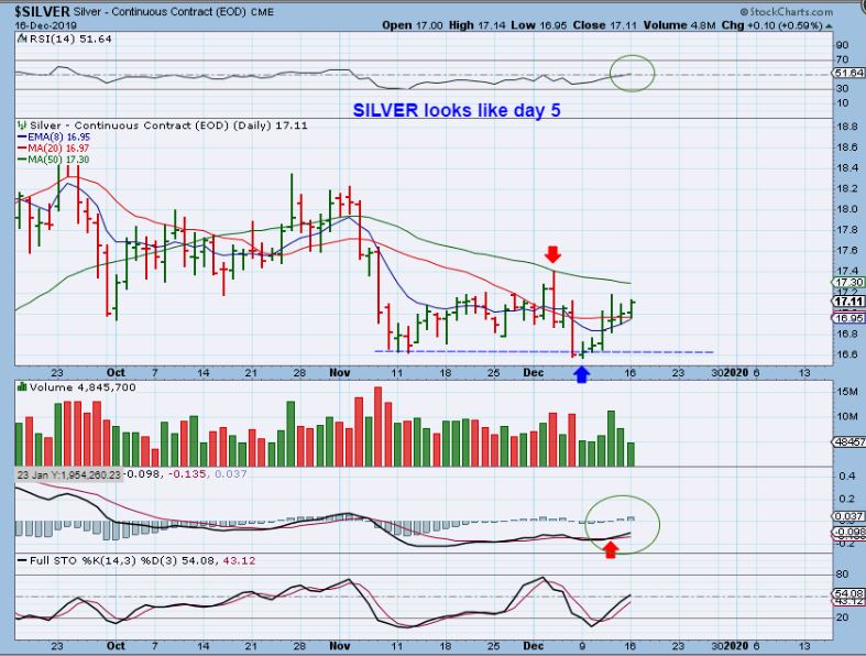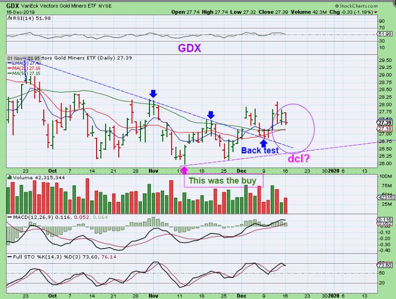 I also said that GDX can run higher to possibly day 28-30, and then just pull back on day 30-32 or so for a higher dcl.  Surprises may come to the upside,  so I posted this chart DEC 6th to show how we can just get higher highs & higher lows going forward.   Where do you want to buy if that happens?  Since we just can’t know for sure what will happen next, where is the “perfect buy’?  You probably won’t know until hindsight, so I already said that I am heavily invested after the FOMC MTG.