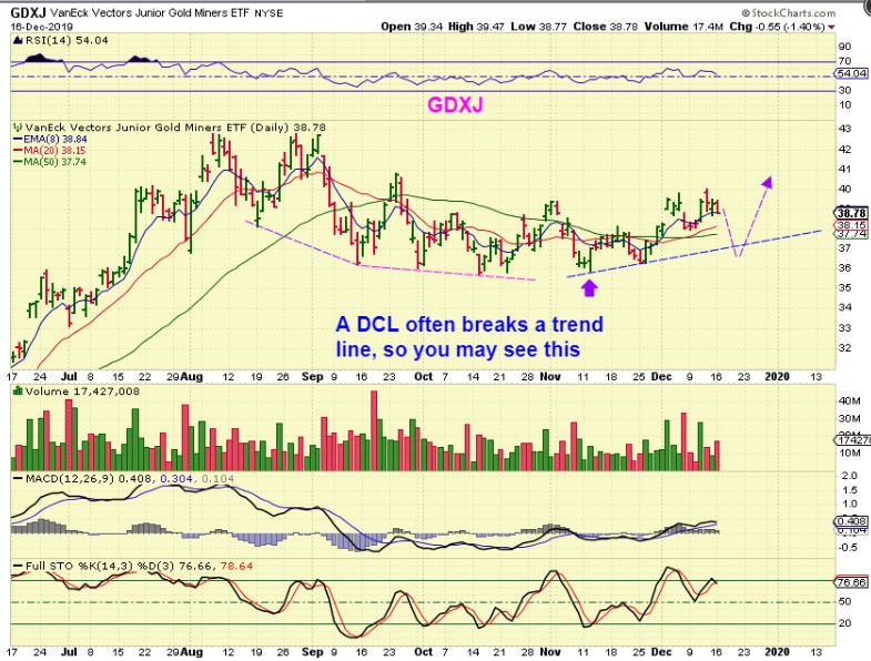 GDXJ  – FINALLY – Could we see this? Yes, this may be what the next dcl looks like, but there are no guarantees when we get surprises to the upside. You may simply want to buy the dip if this happens, or add on a break higher because it shows strength late in a daily cycle.
