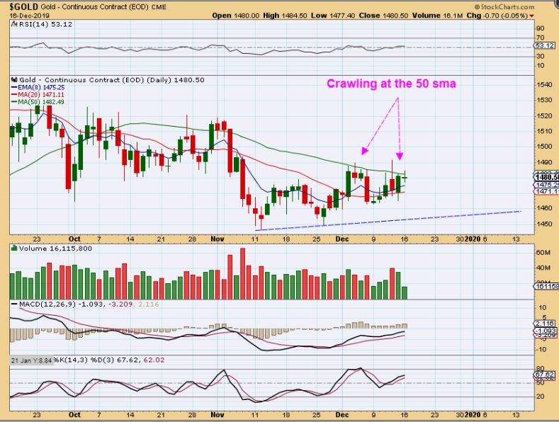 GOLD  – GOLD is pushing along the 50 sma.  This is day 23 and it looks like a day 21 high.  It can drop to a dcl next, or break out.  It looks like the ICL is in place from the Nov DCL and we are just chopping sideways.