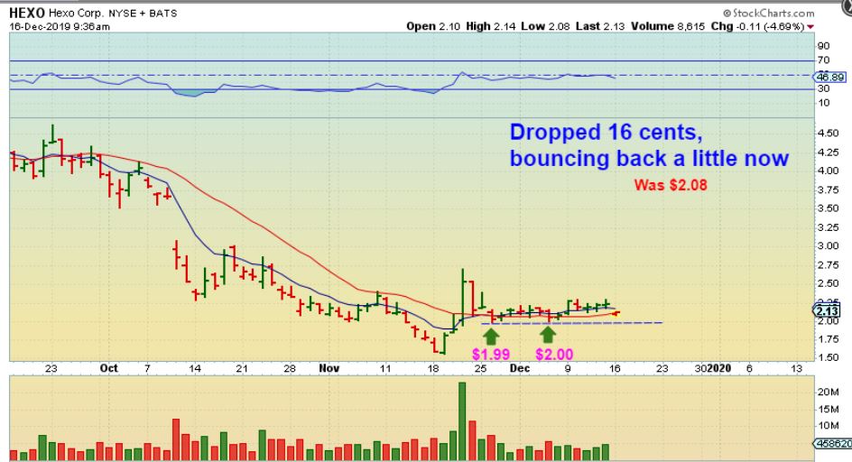 HEXO – HEXO released earnings and dropped, but I captured this 6 minutes into trading to show what I am looking at.  The red line was the 20 sma. I’d like to see that hold, and was also watching the last 2 lows of this consolidation  ( $1.99 & $2.00).  At this point,  the low of the day was $2.08.