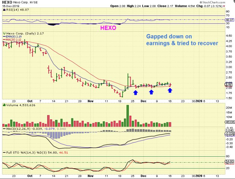 HEXO – That $2.08 low was never taken out again, so at this point we may have a reversal for HEXO and earnings are now behind us.