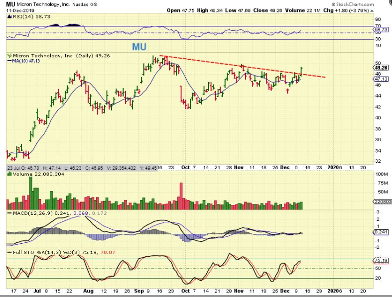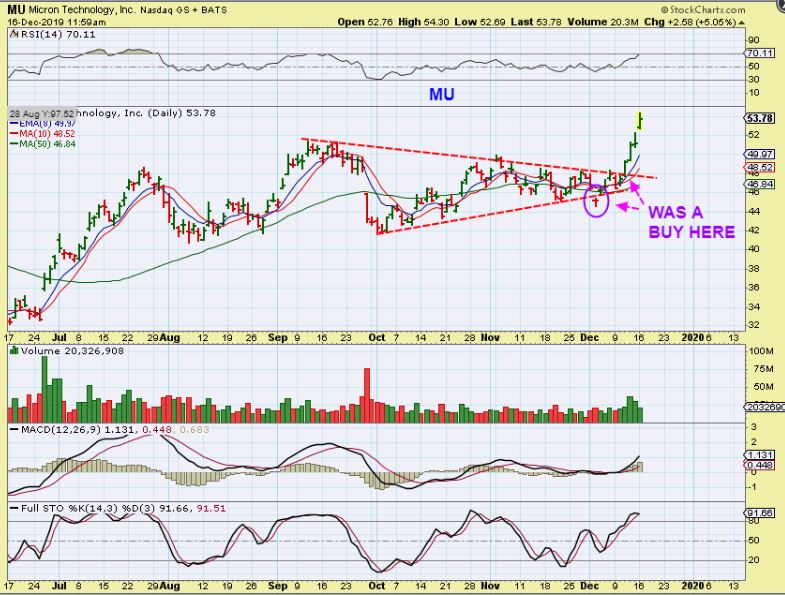 MU  – MU, TSEM, & AMD  were buys earlier in December. MU was an abandoned baby low and as it broke the down trend, so I posted this chart on Dec 11.  IF YOU TOOK THAT TRADE…
