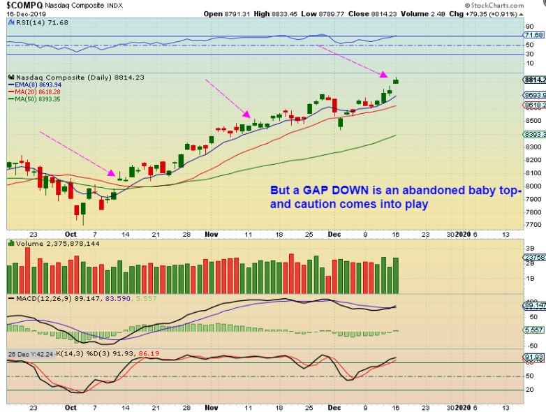 NASDAQ – A LARGE GAP DOWN would look like an abandoned baby here too. A smaller gap down may not matter as price pauses.