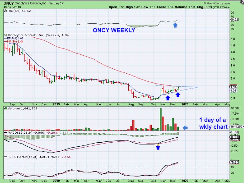 ONCY WEEKLY  – This was on my watch list, but it popped 20% yesterday.  Well, if ONCY pulls back, it could be a nice one to own, since this weekly chart has very good potential. It  looks like it is preparing to break out & run higher over time.