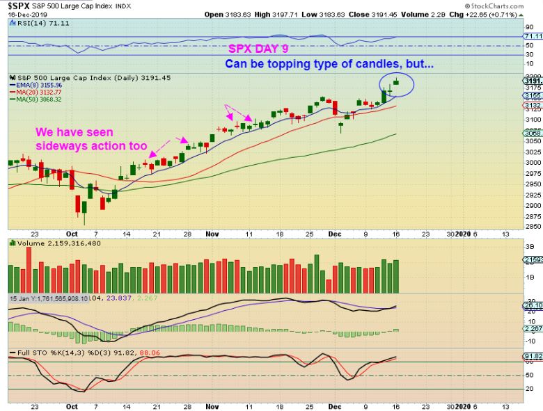 SPX  – SPX had a gap open and then a sell off into the close. That can be a topping type candle, but we have seen these just cause a ‘pause’ lately.  See the chart.  A LARGER GAP DOWN could cause an abandoned baby top.  This is day 9, a top here would be L.T., and blow off top would just see markets continue higher.  I’d use a stop under the 13 or 20sma.