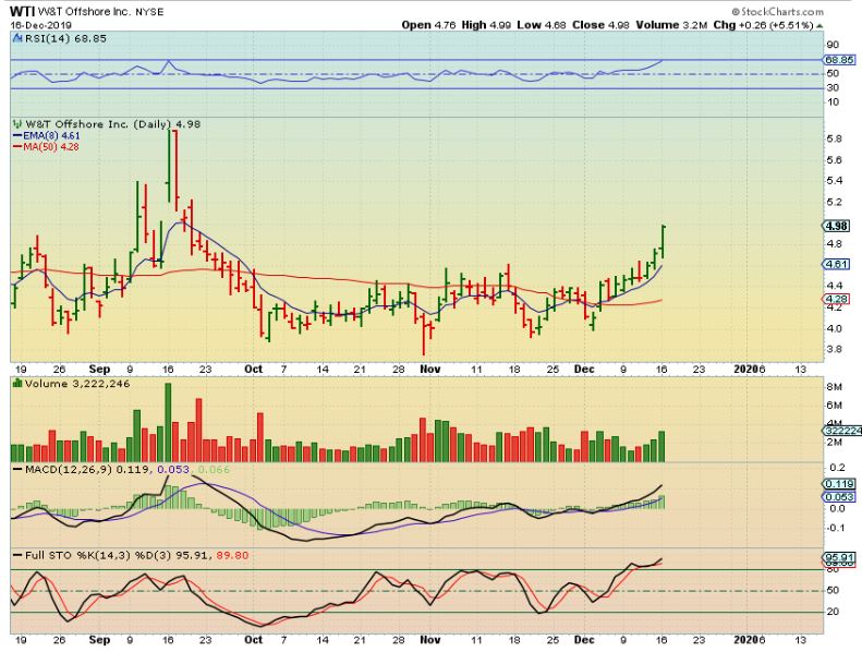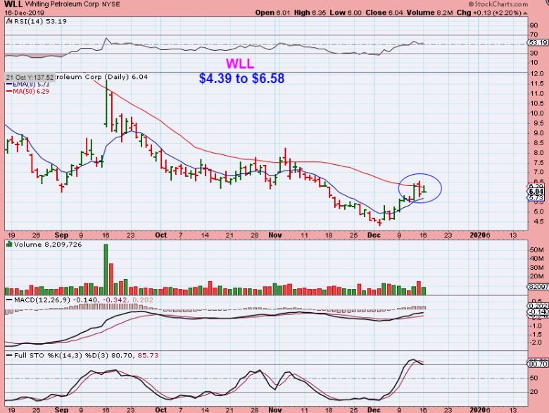 WLL – WLL is also climbing up the 8 ema, and stalled at the 50 sma,  so this would be a good entry too. I know they show up as overbought on the stochastics, but this can continue.  This can still run like we see with DNR & WTI charts above.