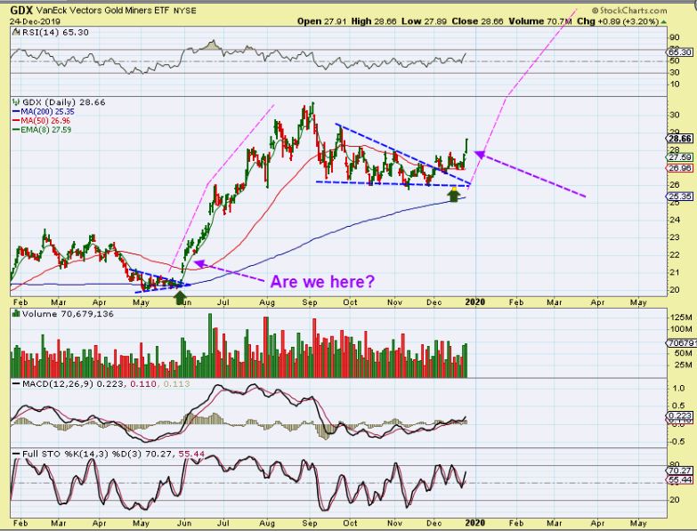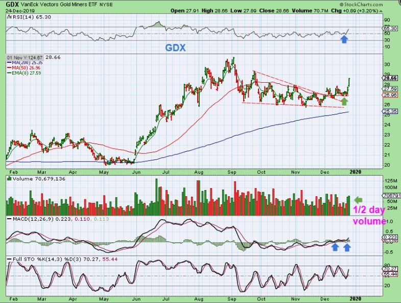 Why do I say that it is important to be invested in the Precious Metals now?  Many were looking at the COT and thought that ‘Smart Money Shorts’  meant that we’d get a strong pull back in gold before a run higher.  THIS may have encouraged ‘shorting Miners’ as Gold reached the 50 sma.   As this runs, they have to cover their shorts and we get a very strong short covering rally along with Buyers jumping in trying not to miss out.  This is what I said I thought would happen last June with that break away gap,  and we may see that now.  So below I will cover several trade ideas in various sectors, but I am very heavily invested in Miners at this point, so I’ll focus there a little more today.  I’ll try to mix it up a bit more later  ( Energy, Tech, etc).   We thought that maybe this would be a low volume week of holiday trading,  but the markets are full of surprises!  And Bull Markets often surprise to the upside  ( right Ed? )  🙂