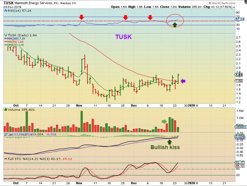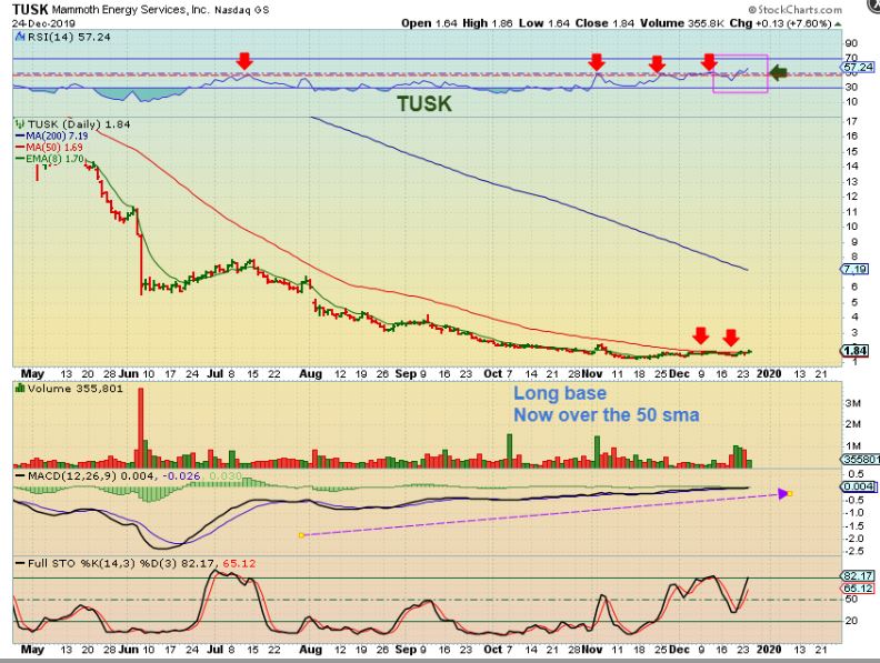 TUSK #1 – One of our readers that used to be in the live trading / comments area  (  Thanks RAY) Pointed out TUSK to me a week or so ago.  I like the way it is setting up and it has now closed over the 50 sma twice.  This is Bullish.  What do I like most about the TUSK Chart?…