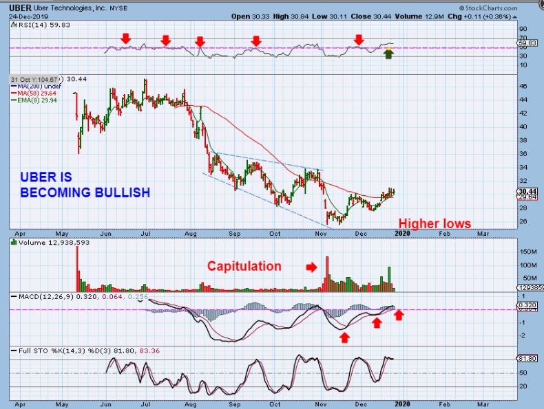 UBER  – I heard that the UBER CEO stepped down so I looked at the chart.  It is now looking Bullish to me, with higher lows, a Bullish MACD & RSI, etc. It could be bought here at the 50 sma as a low risk entry with a stop.