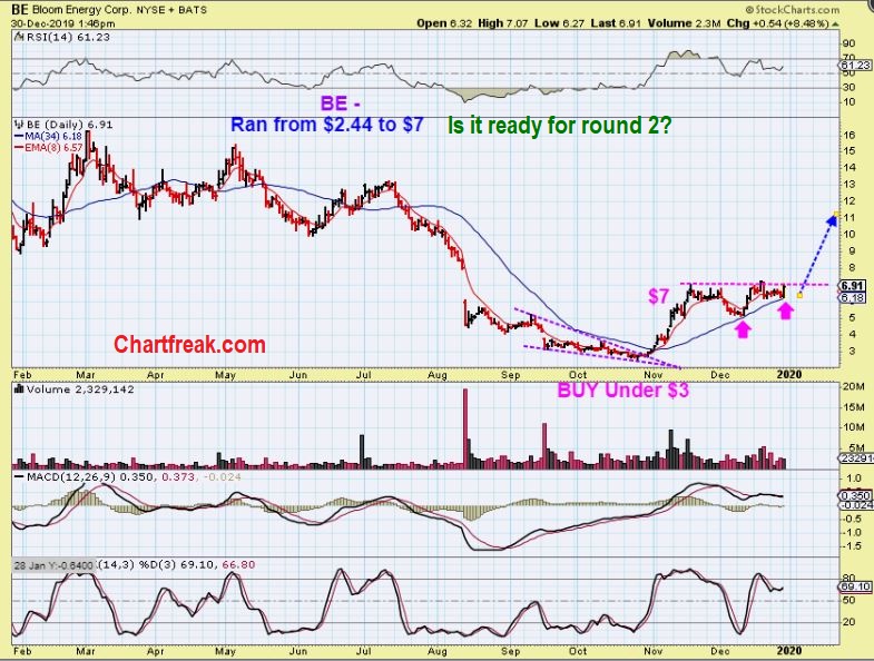 BE – I bought this Monday near $6.90 as a trade and posted it in the live trading area.   This looks like a flat topped wedge ready to break out.  It can run swiftly.  Another bullish view of ‘BE’ is…