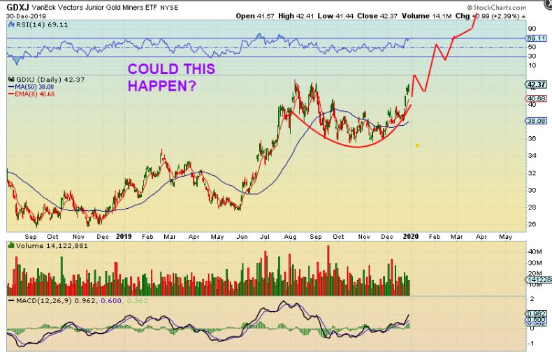 GDXJ  – Would I be exaggerating or dreaming if I said that GDX or GDXJ could form a cup and then after a very small handle just keep running like this? This would leave many behind that are waiting for a dip, a dcl, or a gap fill, and…