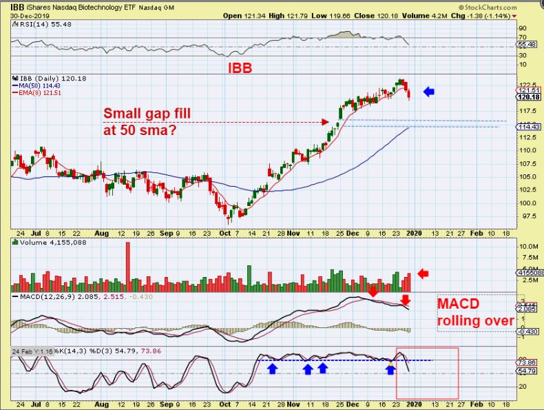 IBB  – The IBB or XBI broke the uptrend, the 8 ema, and the volume selling is increasing. Also notice the MACD broke down and the Stockhastics finally dropped back below 80. THIS could be a sign that the markets are ready to begin a dip lower. It is something to take note of and keep an eye on.
