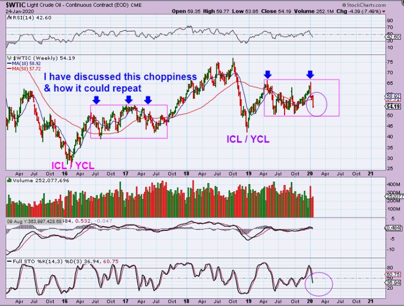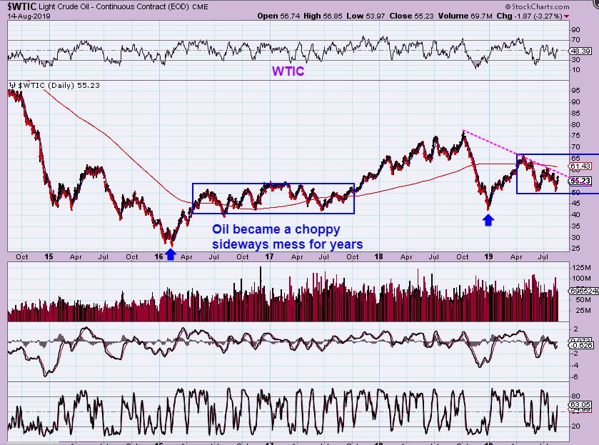 WTIC WEEKLY – Long ago ( This chart was created on AUGUST 14 2019!) I pointed out how OIL might rally, drop, rally, & just Chop in the same choppy manner that we saw coming out of the ICL in 2016. That could be short term trade-able, but really kind of frustrating.