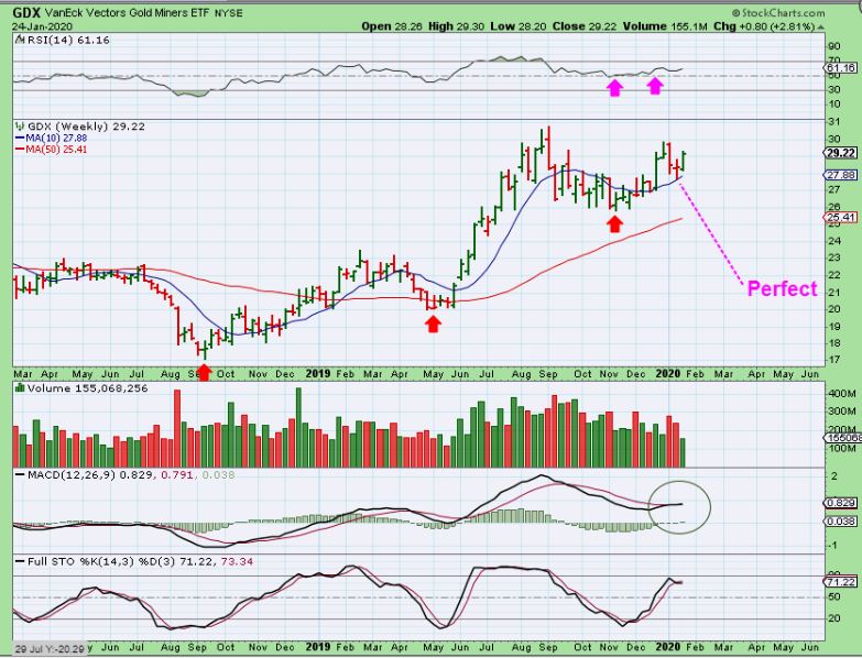 GDX WEEKLY – Now look at the weekly chart and we actually had a perfect dip to the 10 week ma as that dcl & then it reversed higher. I admit that this could just chop around and form a handle on a cup, but at this point it looks pretty bullish, and could just break out & run higher.
