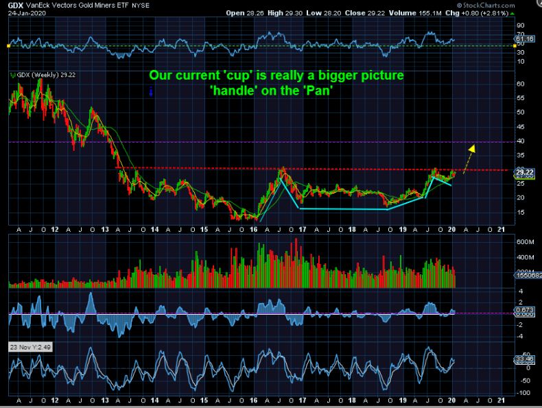 GDX WEEKLY BIGGER PICTURE – The ‘Step back & look at the Bigger Picture‘ view that I love to present here in the weekend reports remains absolutely Bullish! This is actually an enormous 7 year base! We have also recently formed a giant Pan with a handle at multiyear resistance. When this breaks out higher, it could rally to the $40 area before hitting significant resistance.