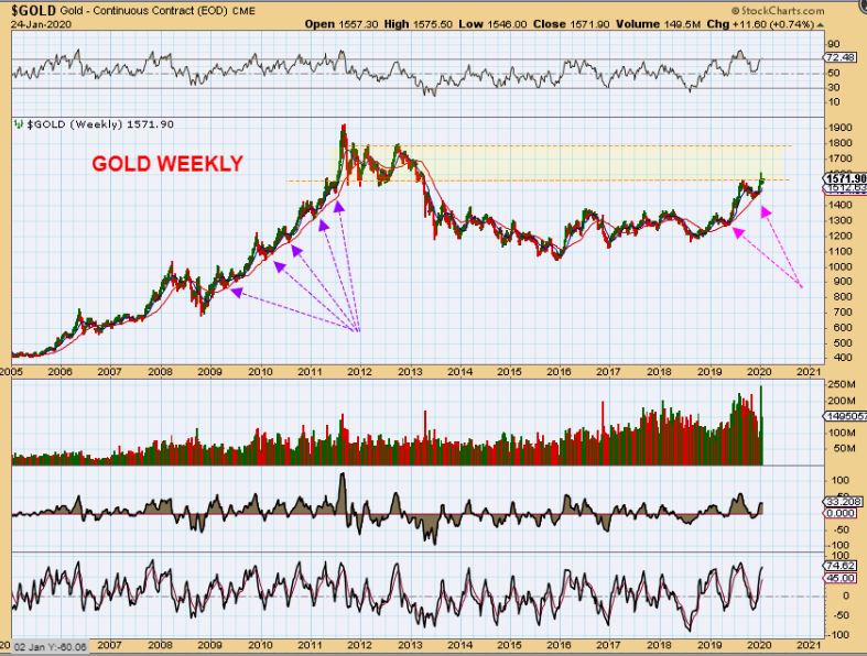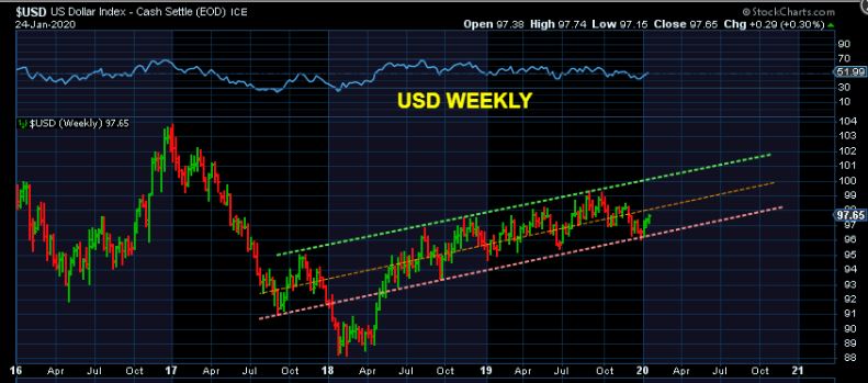 USD WEEKLY – If I draw it going back 4 years like this, it looks to be chopping higher. I will point out that the USD has been rising for almost all of January, and Gold is still near the highs, so USD strength does not bother me at this point.