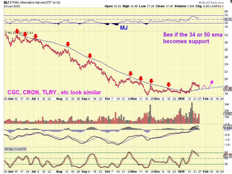 The General Markets are due for a Daily Cycle Low ( DCL). The last dip only lasted 3 days, so we can keep an eye on the markets and see if they try to sell off & bottom around the time of the FED MTG this week or not. The MJ Sector dropped with the General Markets and several MJ Stocks like CRON, CGC, TLRY and so on seem to want to drop to the 34 or 50 sma. When we get a General Market DCL, MJ Stocks may or may not begin the next leg higher too. I will be watching for that.