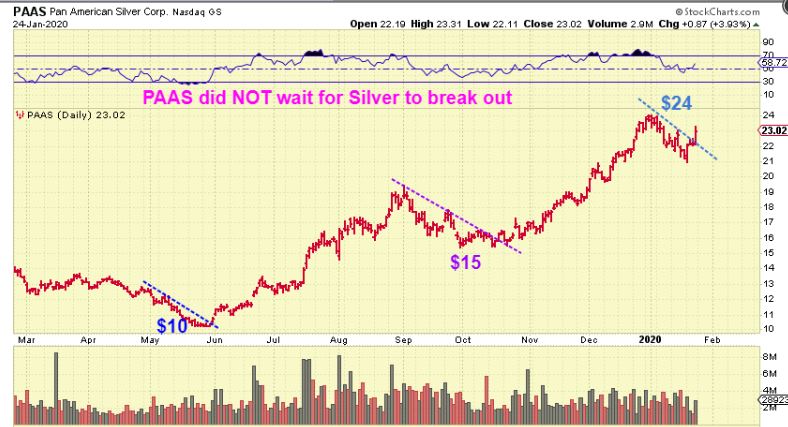 PAAS, SVM, SSRM, etc are silver companies already shaping up into very beautiful charts with Silver still in that base. PAAS is a buy again too.