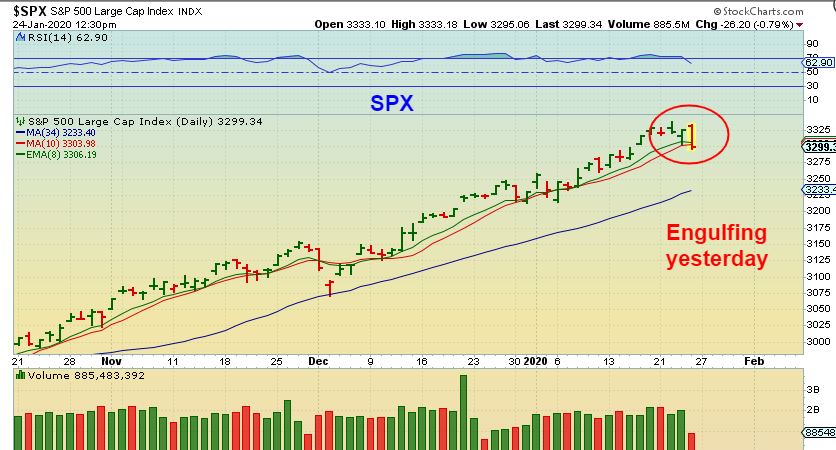 I posted this chart midday Friday as the markets sold off, and that would be a bearish engulfing candle. We are due for a dip into a dcl, you can see that the last one only lasted 3 days, and the markets did close with that bearish engulfing candle. I would expect more selling, maybe to the 34 or 50 sma…